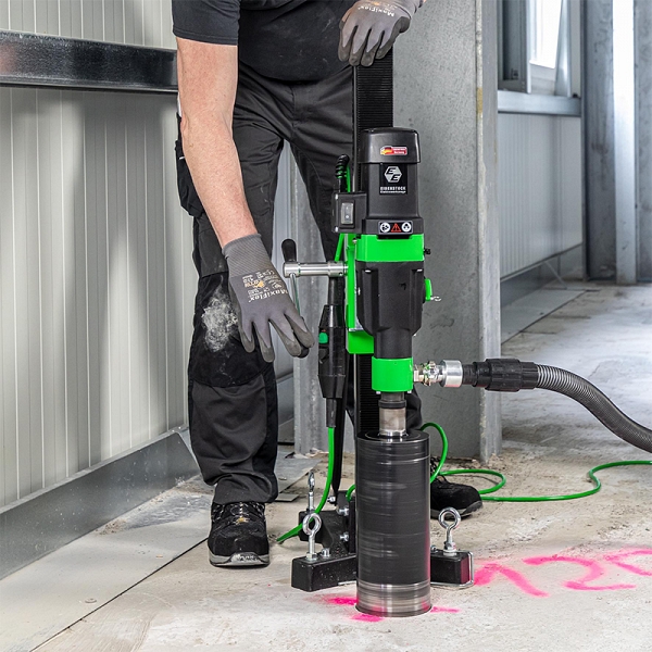 - Идеальное решение для буровых работ, где условия на площадке не позволяют использовать мокрое бурение (пустотелые потолки, предотвращение повреждения водой и т.д.)